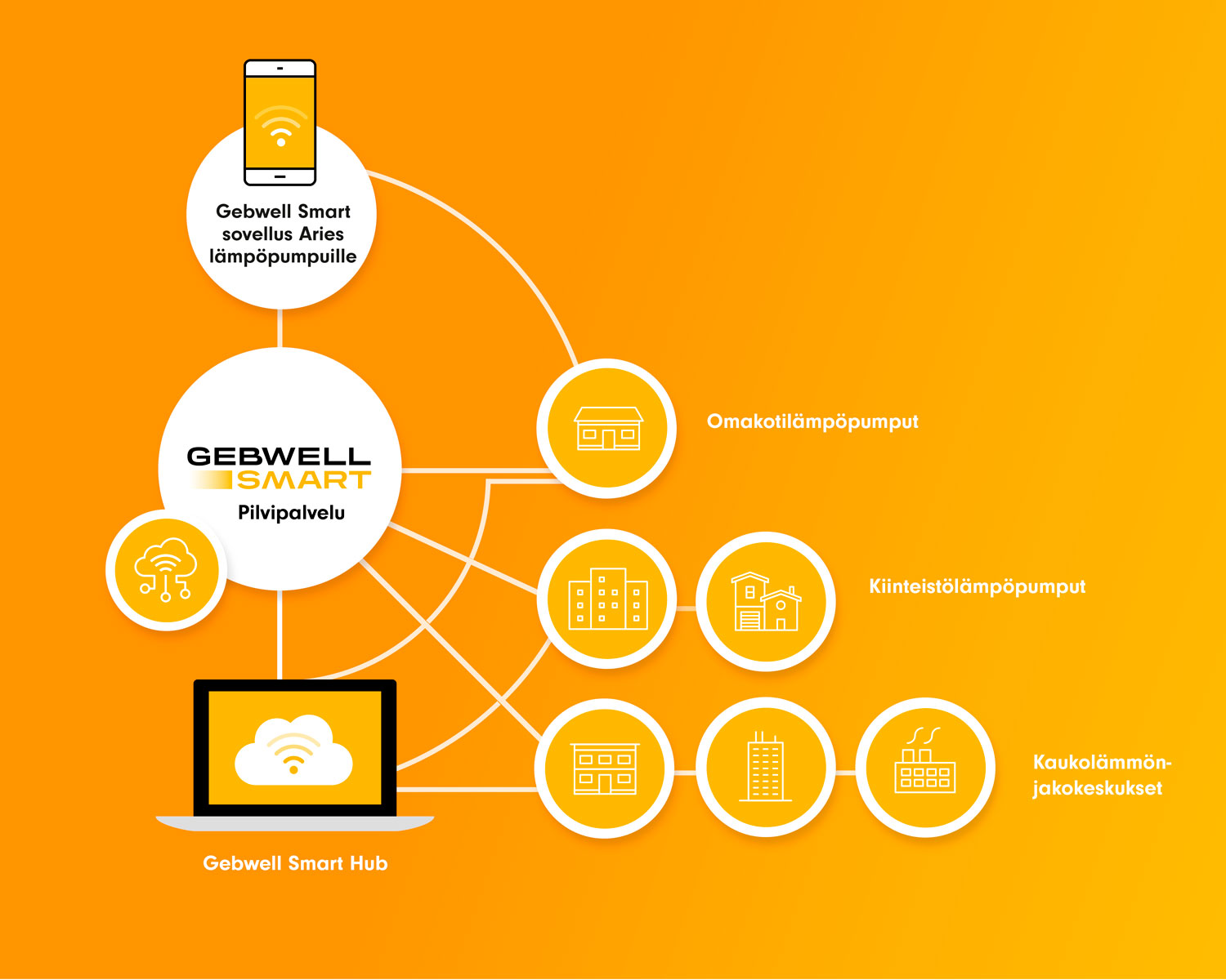 Gebwell Smart lämpöpumput ja G-Power Smart kaukolämmönjakokeskukset ovat yhteydessä pilvipalvelun kautta selainpohjaiseen Gebwell Smart Hubiin, josta asennus-/huoltoliike näkee asentamiensa Gebwell Smart lämmityslaitteiden reaaliaikaisen tilanteen.